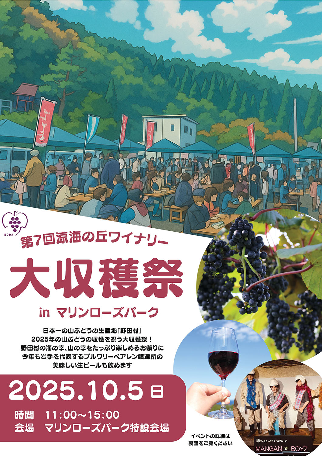 涼海の丘ワイナリー醸造の山葡萄ワインと、野田村の海の幸、山の幸をたっぷり楽しめる美味しいお祭りです。