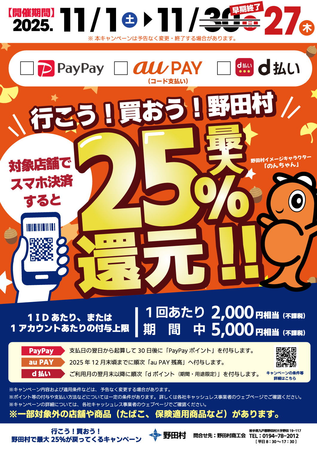 令和7年11月1日(土)から実施している「野田村キャッシュレス決済ポイント還元事業【行こう!買おう!野田村で最大25%が戻ってくるキャンペーン】」につきましては、ご好評につき期間満了を待たずに還元額が上限に達する見込みのため、令和7年11月27日(木)をもって早期終了することとなりましたのでお知らせいたします。
