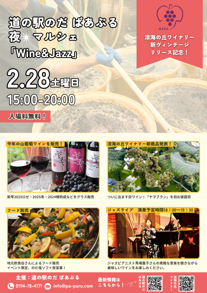 野田村の飲食店による美味しいお料理とともに、生産者の想いが込められた山葡萄ワインの新酒を、ジャズの音色に包まれながらぜひお楽しみください。